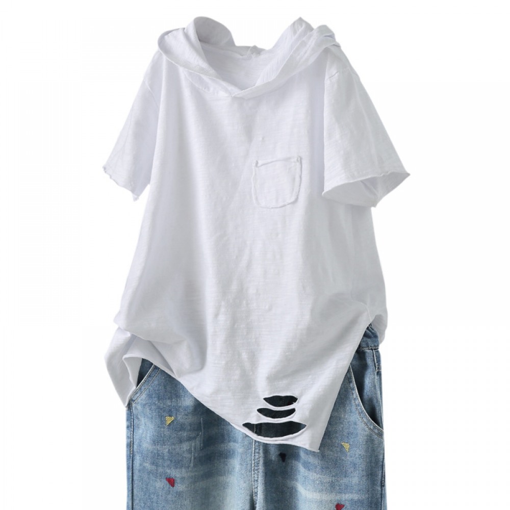 Cotton Hooded T-Shirt Women Summer New Loose Short-Sleeved Literary Hole Casual Top